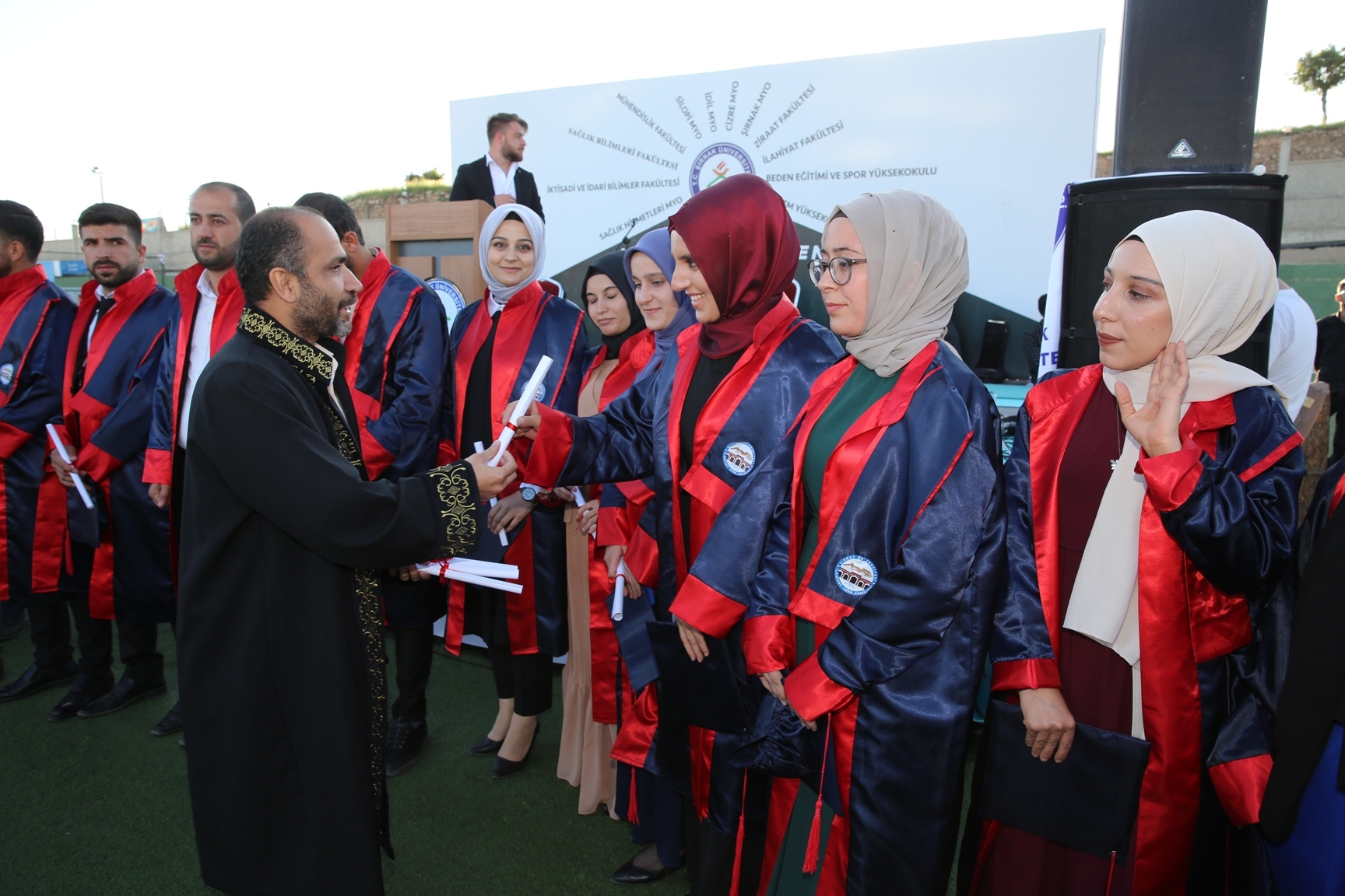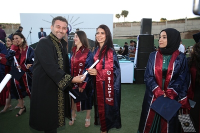 Üniversitemiz fakülte, yüksekokul, meslek yüksekokullardaki bölümlerinde okuyan öğrencilerin mezuniyet töreni, kampusumuzdaki stat da gerçekleştirildi. Mezuniyet törenine Şırnak Valisi Osman Bilgin, Şırnak Belediye Başkanı Mehmet Yarka, Rektörümüz Prof. Dr. Mehmet Emin Erkan, kurum müdürleri, rektör yardımcılarımız, akademisyen ve idari personel ile çok sayıda öğrenci velisi katıldı.Saygı duruşu ve İstiklal Marşı ile başlayan 2021-2022 mezuniyet töreninde ilk konuşmayı yapan Sağlık Bilimleri Fakültesi Sosyal Hizmet Bölümü ve üniversitemiz birincisi Asiye Algit kendisine verdikleri emekten dolayı Şırnak Üniversitesi hocalarına teşekkür etti.Ardından kürsüye gelen Rektörümüz Prof. Dr. Mehmet Emin Erkan, uzun bir yaşamın ilk dönemecine girerken bütün öğrencileri olabildiğince hayata ve mesleklerini icra edebilecekleri sektörlere hazırlamaya çalıştıklarını vurgulayarak; “Mezun olurken biz size bir anahtar veriyoruz. Şırnak Üniversitesi’nde öğrenciyken her türlü desteği verdiğimiz gibi mezun olduktan sonra da sizin yanınızda olacağımızı belirtmek isterim. Hemen hemen bütün bölümlerde yüksek lisans ve doktora programlarımız var. Sizleri yüksek lisans ve doktora programlarında da görmek hele ki öğrencilerimizin akademik kadrolarda çalıştıklarını görmek bizi çok sevindirir” dedi.Daha sonra konuşan Şırnak Belediye Başkanı Mehmet Yarka, Cumhurbaşkanı Recep Tayyip Erdoğan’ın ‘2008’de 81 ilde üniversite kuracağız’ söylemi üzerine Şırnak’ta üniversite mümkün olabilir mi? diye düşündüğünü ancak bugün Şırnak Üniversitesi’nin mezunlarını gördüğünde yaşadığı heyecan ve mutluluğu anlatamadığını dile getirerek; “Evet, hayaldi gerçek oldu. 2008’de ki Sayın Cumhurbaşkanımız Recep Tayyip Erdoğan’ın hayali gerçek oldu. Şırnak Belediyesi olarak üniversitemizin ne ihtiyacı varsa temin etmek, siz gençlerimizin sorunlarını-sıkıntılarını gidermek için ne gerekiyorsa yapmaya hazır olduğumuzu belirtmek isterim” şeklinde konuştu.Şırnak’ın bundan böyle sporun, kültürün, sanatın, bilimin, ticaretin merkezi olacağının altını çizen Şırnak Valisi Osman Bilgin ise “Hayal ettiğimiz Şırnak’ı inşa etmek için bütün kurum-kuruluşlarla, bütün Şırnaklılarla ve özellikle de siz gençlerle el ele vereceğiz. Bizler elimizden geleni yaparken siz mezun olan sevgili gençler de gittiğiniz her yerde bizlerin elçileri olacaksınız. Burada yaşadığınız güzellikleri, dostlukları anlatmak ahde vefa borcunuz olacaktır” dedi.Konuşmaların ardından Sağlık Bilimleri Fakültesi Sosyal Hizmet Bölümü ve üniversitemiz birincisi Asiye Algit, mezuniyet kütüğüne plaket çaktı. Daha sonra ise Rektörümüz Prof. Dr. Mehmet Emin Erkan bütün bölümlerin üçüncülerine; Şırnak Belediye Başkanı Mehmet Yarka bütün bölüm ikincilerine; Şırnak Valisi Osman Bilgin ise bütün bölüm birincilerine mezuniyet belgelerini verdi.Toplu fotoğraf çekimleri ve kep atma töreninden sonra Şırnak Üniversitesi 2021-2022 yılı mezuniyet töreni öğrencilerimizin sahne aldığı müzik şöleni ile devam etti.