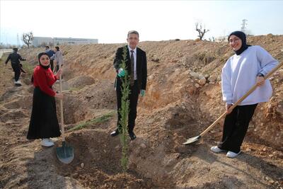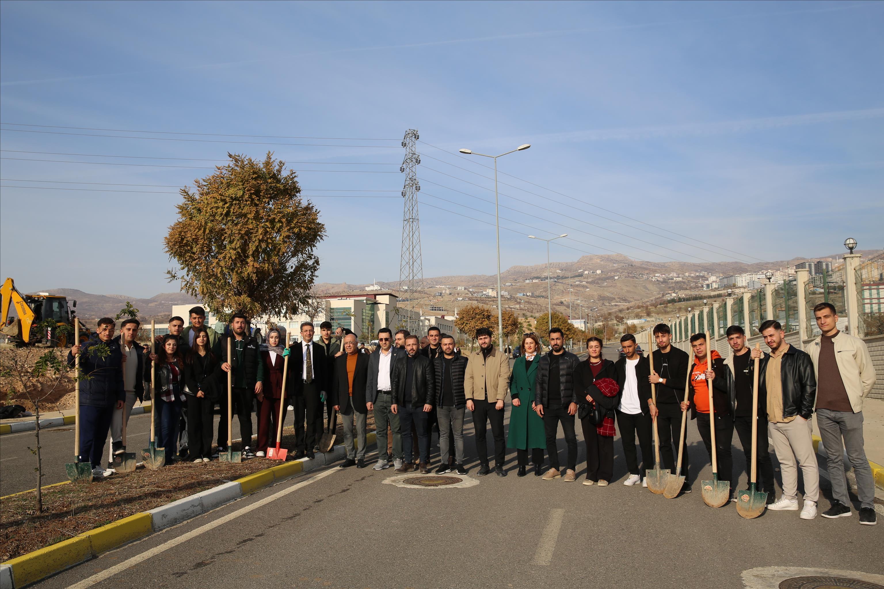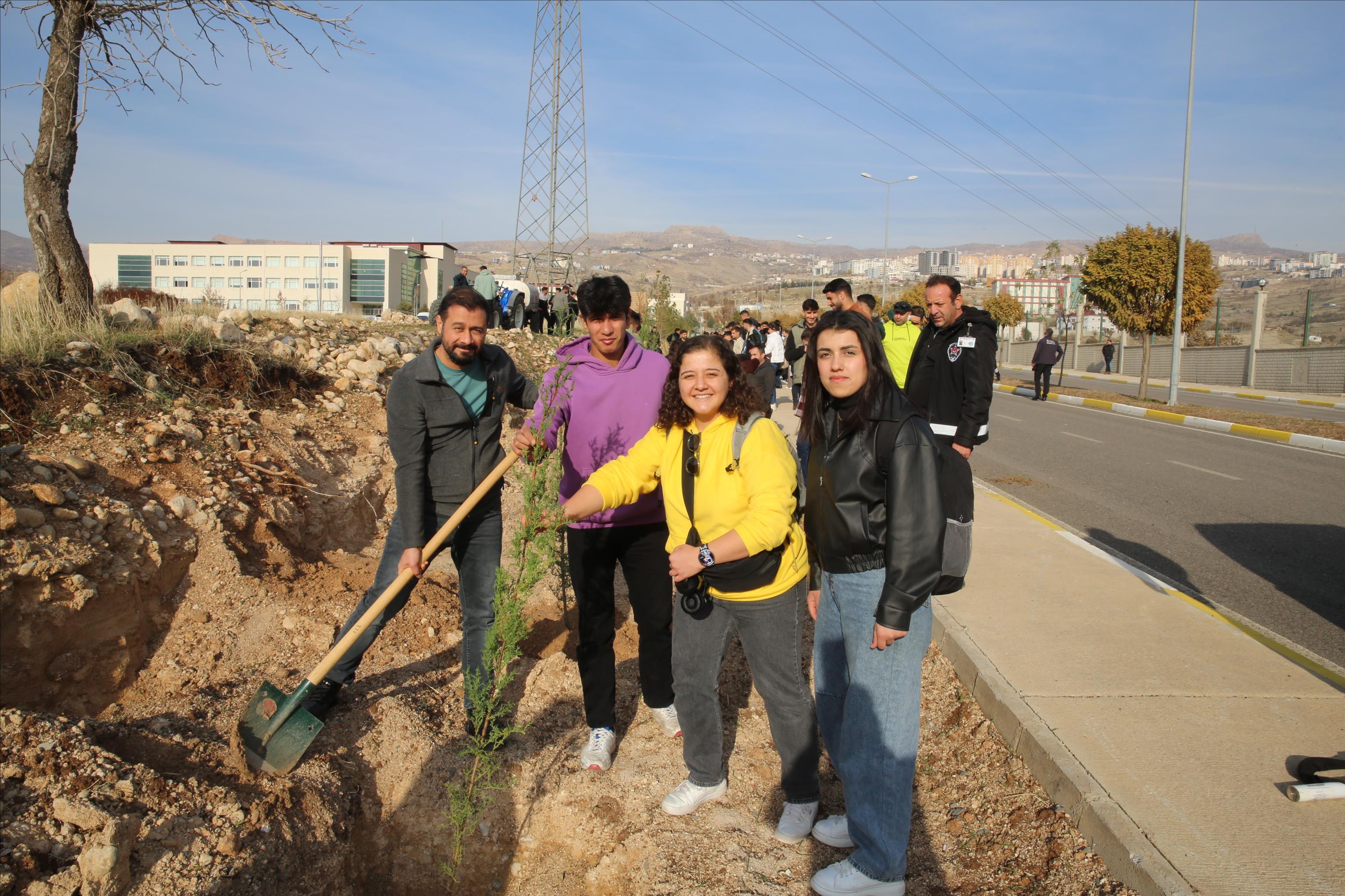 katılan Rektör Prof. Dr. Abdurrahim Alkış, öğrencilerle birlikte fidan dikerek
